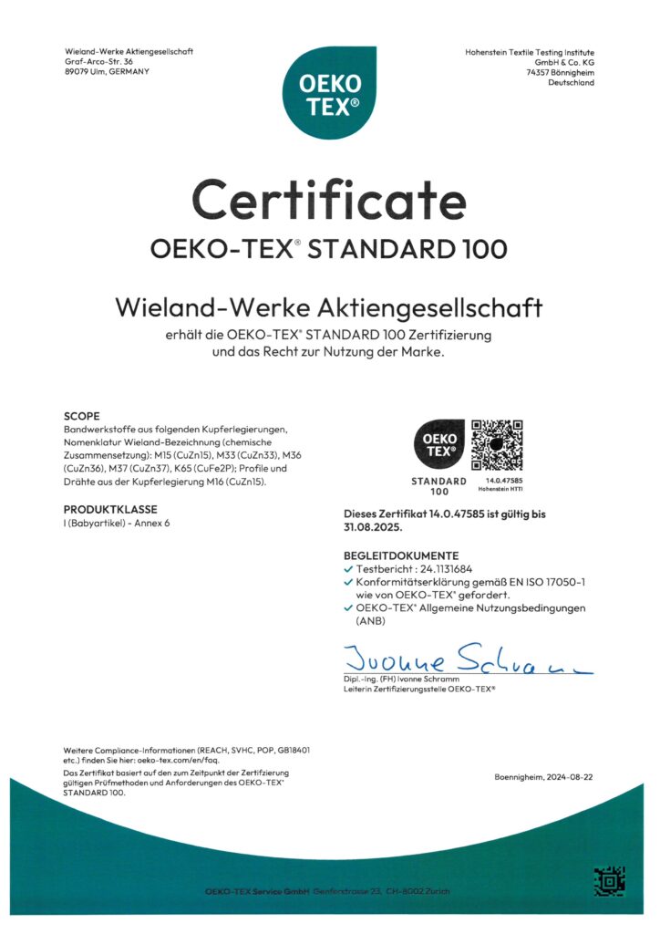 One of the bases for our high standards is the TOMBAK product material, manufactured and procured in Germany. This high-quality and durable brass grade is guaranteed to be free of harmful substances and nickel according to EU Directive 94/27/EC and Regulation 197/2006 (REACH). Certified in accordance with DIN EN 10204, the raw material consists mainly of copper, with approximately 85 per cent. In order to guarantee consistently high quality, the material is also certified according to Oeko-Tex standard 100.